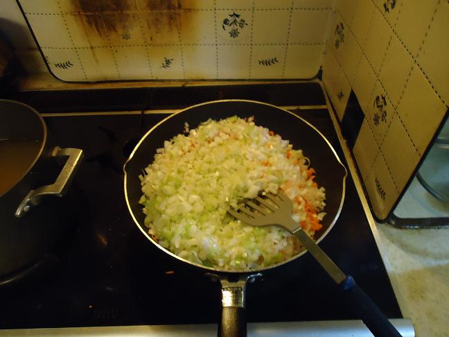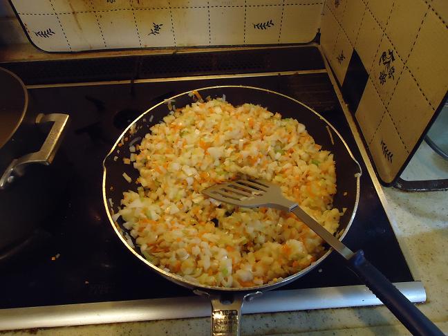④③で出来たみじん切りの野菜をフライパンで軽く炒めます。